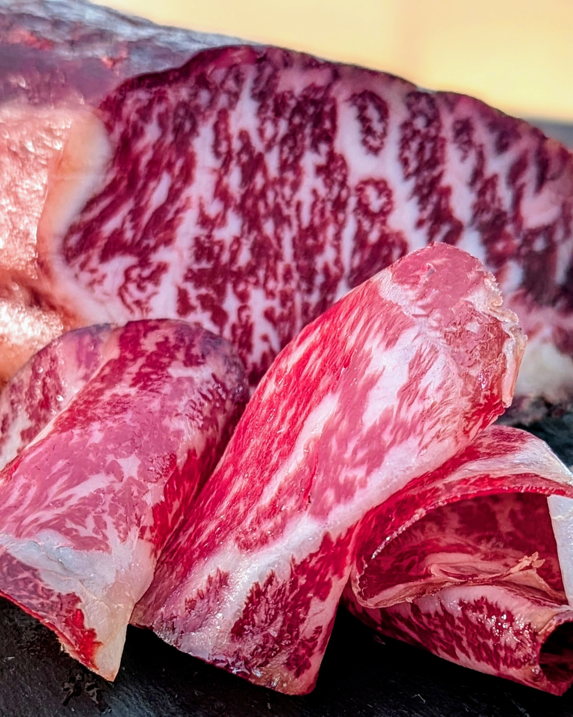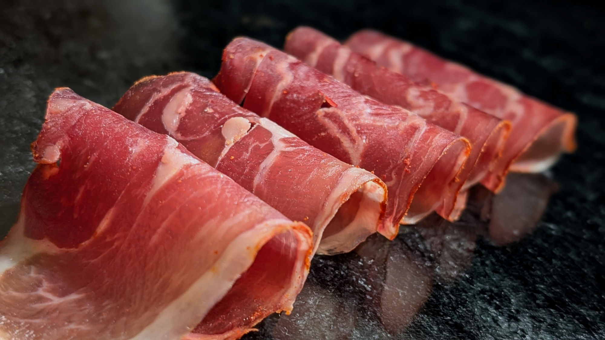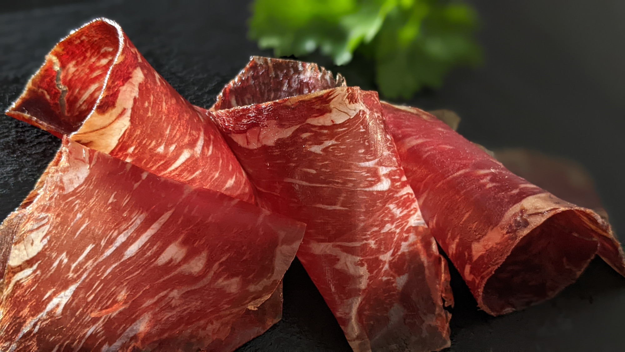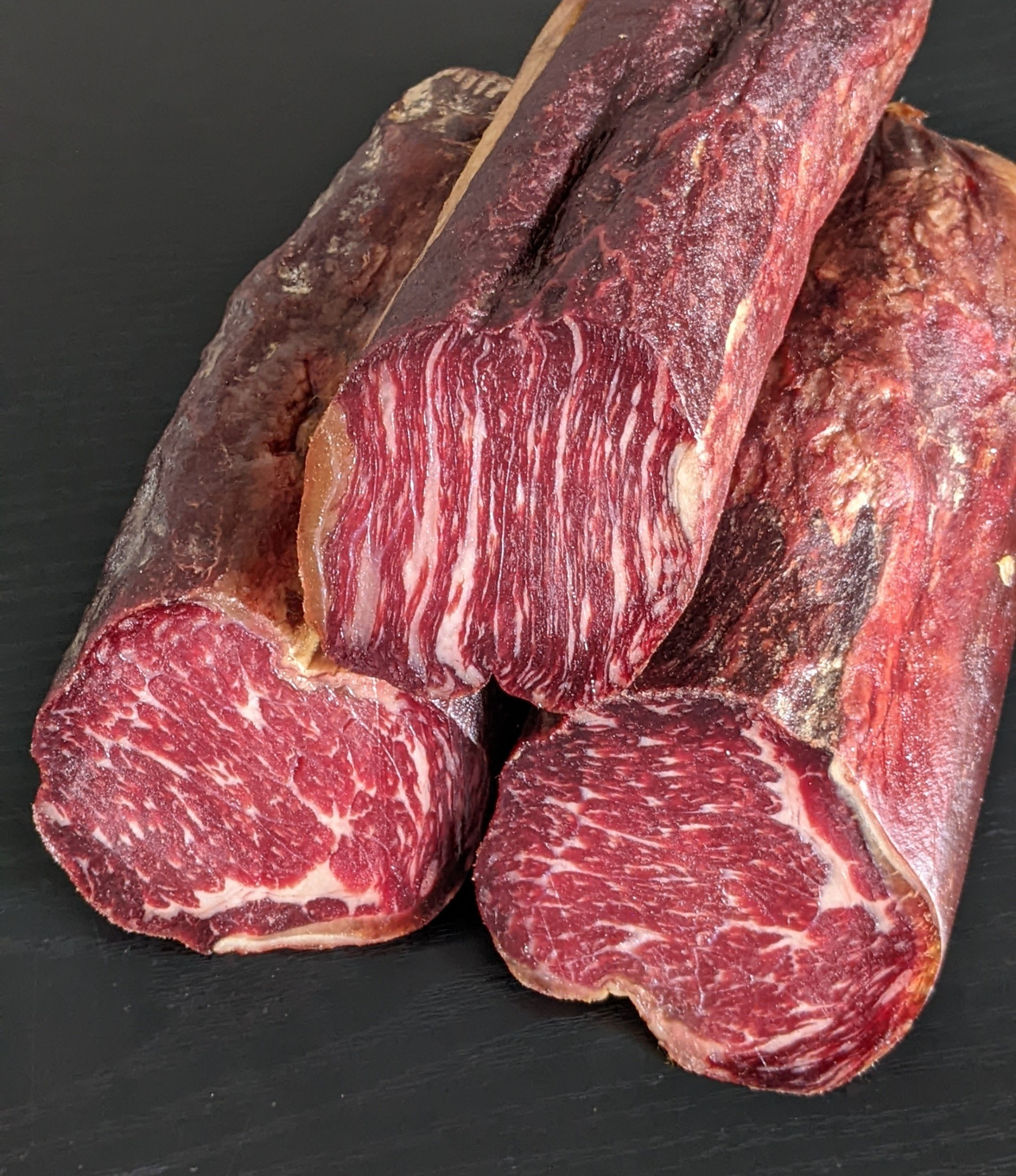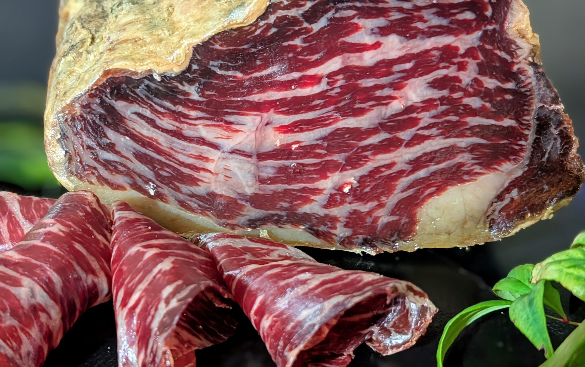 Cured meats in different varieties, such as Wagyu, Black Angus, and beef. Cured lamb loin, roast beef, and roast lamb, cured Duroc ham, and natural cured meats such as chorizo and salchichón.