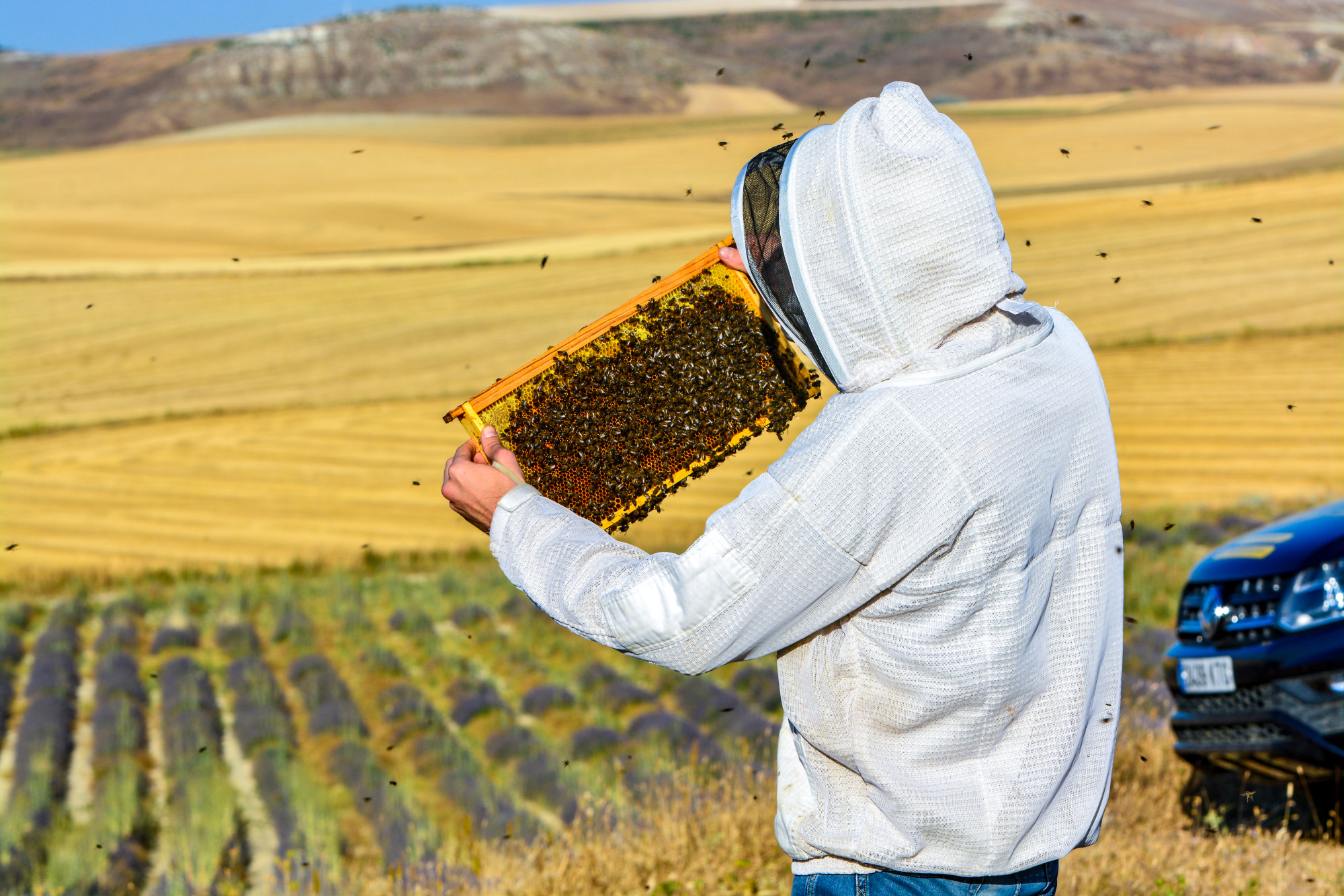 We are in Tiedra (Valladolid, Spain), a small village surrounded by grain fields, lavender and oak trees. In July and August, our bees produce a unique lavender honey. At that time, the fields turn purple — an unforgettable landscape!